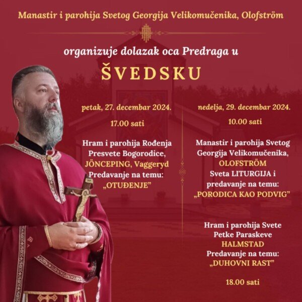 Истог дана, од 18 сати, одржаће и предавање у парохији Свете Петке Параскеве у Халмстаду, на тему: “Духовни раст”. Ово предавање је накнадно додато, а како каже отац, имаће посебну важност за оне који га буду слушали.
