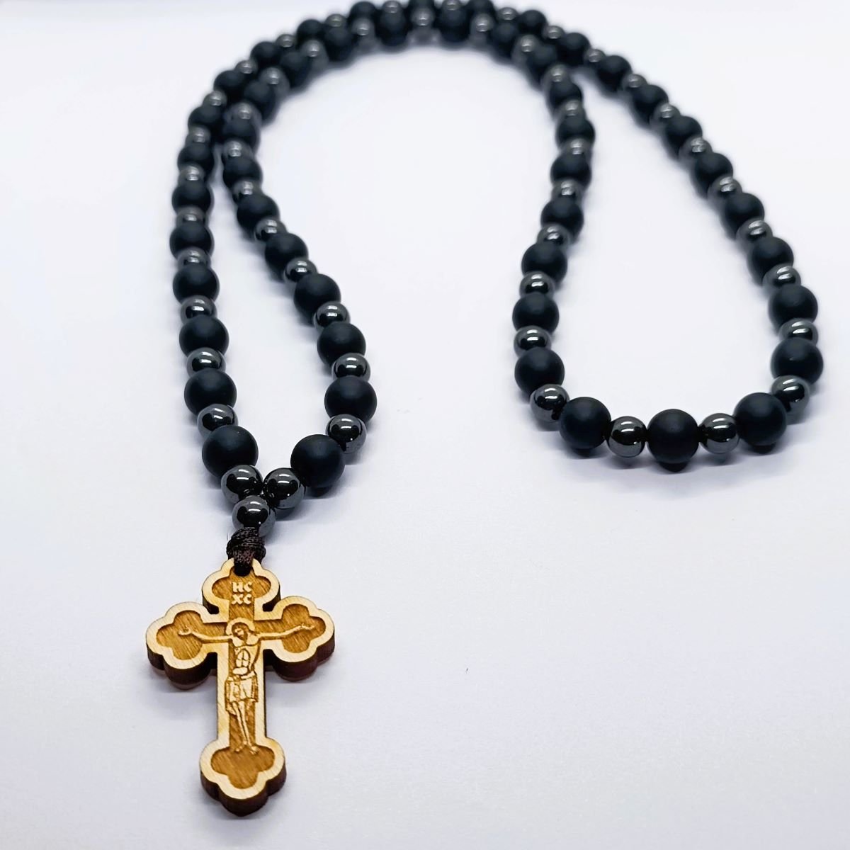 Pronađite duhovnu snagu i unutrašnji mir uz našu ručno izrađenu brojanicu za vrat od mat oniksa i hematita. Ovaj jedinstveni komad nakita kombinuje moćnu zaštitnu energiju crnog oniksa sa vitalnošću hematita, stvarajući elegantan kontrast mat i sjajnih perli. Autentičan drveni krst sa raspećem upotpunjuje celinu, čineći ovu brojanicu savršenim spojem pravoslavne tradicije i modernog stila.