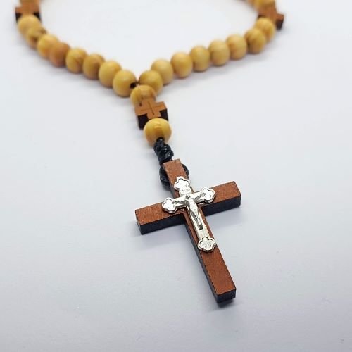 Ono što ovaj model čini posebnim jesu tri manja braon drvena krstića umetnuta između perli u delu za ruku, koji diskretno razbijaju niz i dodaju vizuelnu i duhovnu dubinu. Na samom kraju nalazi se veći drveni krst na kome je postavljeno metalno raspeće, čineći ovu brojanicu ne samo predmetom za molitvu, već i snažnim simbolom vere koji možete uvek nositi sa sobom.