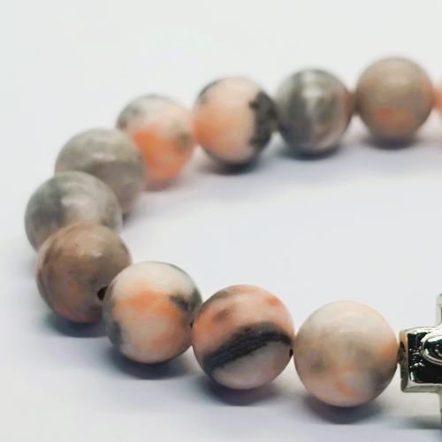 Otkrijte jedinstvenu lepotu prirode uz ovu elegantnu brojanicu za ruku, ručno izrađenu od retkog ružičastog zebra jaspisa. Svaka perla ovog poludragog kamena poseduje karakteristične pruge i šare koje podsetaju na zebrine crte, stvarajući fascinantan vizuelni efekat koji čini svaki komad apsolutno jedinstvenim.